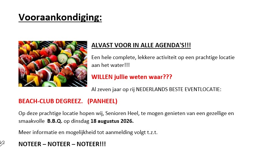 Vooraankondiging BBQ op 18 augustus a.s. Fun Beach (Degreez) in Panheel