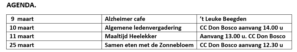 Elke 4e woensdag van de maand van 12.30 – 14.30 uur is er een etentje voor “Zonnebloemers”, verzorgd door vrijwilligers en Don Bosco; Deze maaltijd is ook toegankelijk voor leden van de Seniorenvereniging.