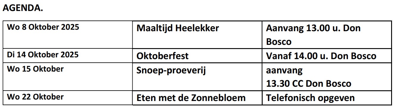 Elke 4e woensdag van de maand van 12.30 – 14.30 uur is er een etentje voor “Zonnebloemers”, verzorgd door vrijwilligers en Don Bosco; Deze maaltijd is ook toegankelijk voor leden van de Seniorenvereniging.